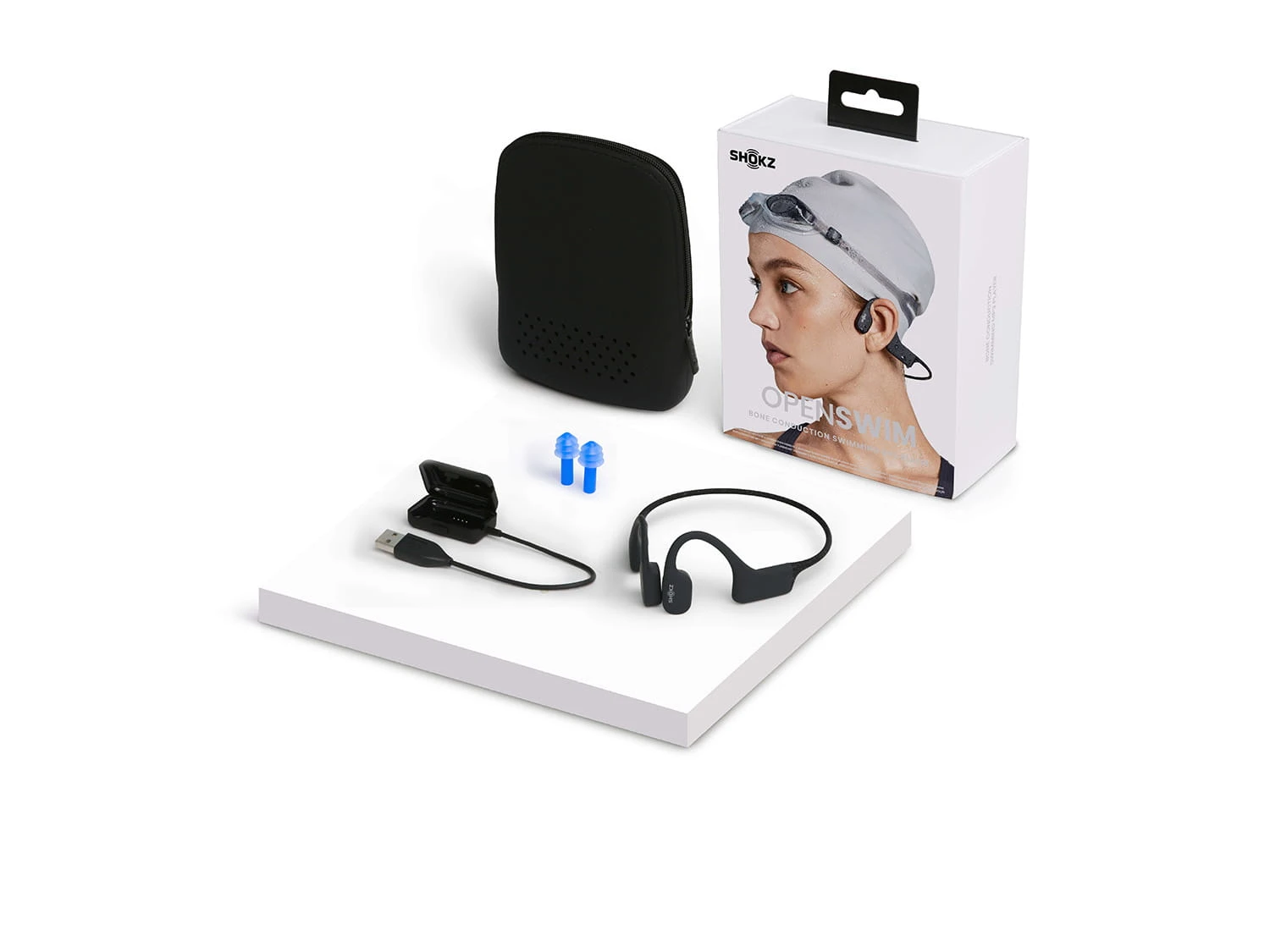 De OpenSwim bone-sound hoofdtelefoon kan gedragen worden met badmutsen, zwembrillen en oordopjes. Het OpenFit titanium ontwerp met omliggende flexibiliteit biedt betrouwbare stabiliteit voor al uw slagen en bewegingen.