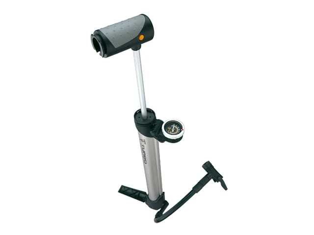 Een ingenieuze combinatie van standpomp en minipomp. Haalt gemakkelijk 12 bar. Precisie manometer. Ideaal voor trainingskampen. Kan praktisch overal op de fiets worden bevestigd dankzij de universele fixer.